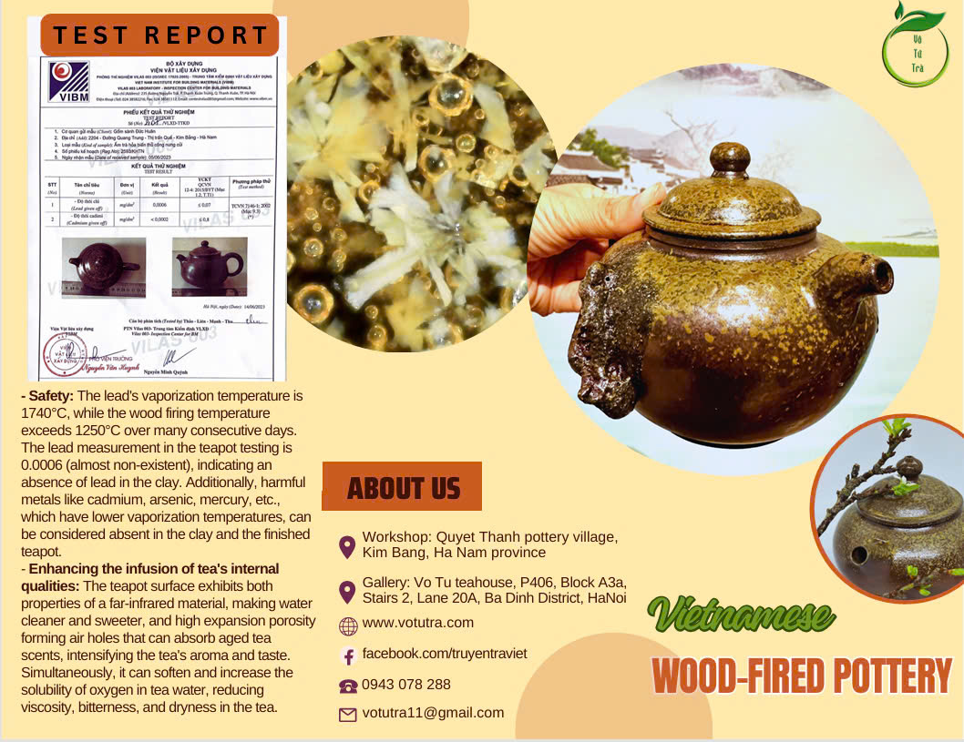 Bản in brochure mô tả ấm sành nung củi.